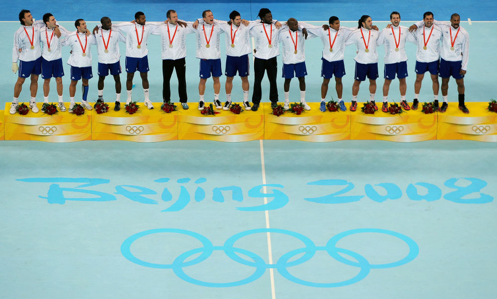 ↑2008年8月24日,法國隊(duì)球員在北京奧運(yùn)會(huì)男子手球冠軍領(lǐng)獎(jiǎng)臺(tái)上高唱國歌。