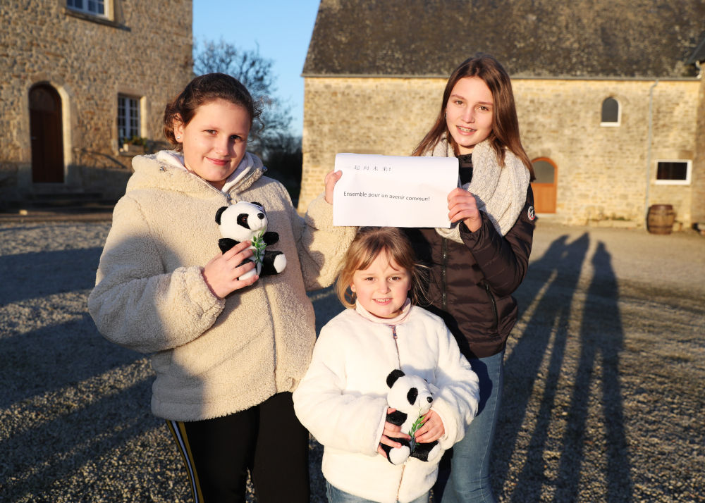 ↑2022年1月14 日,在法國芒什省梅奧蒂市,10 歲的安娜埃爾·瑪麗昂、5 歲的卡米耶·瑪麗昂和12歲的諾拉·瑪麗昂(從左至右)手舉“一起向未來”的主題口號(hào),祝福北京冬奧會(huì)。