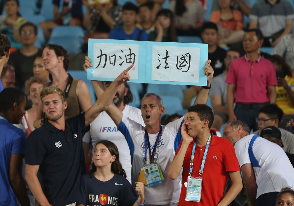 ↑2014年8月25日,一名法國觀眾在南京青奧會(huì)田徑項(xiàng)目男子標(biāo)槍決賽場邊高舉用中文書寫的“加油法國”標(biāo)語為法國選手盧卡斯·穆塔德加油。