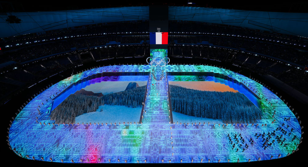 ↑2022年2 月4日,法國代表團(tuán)在北京冬奧會(huì)開幕式上入場。