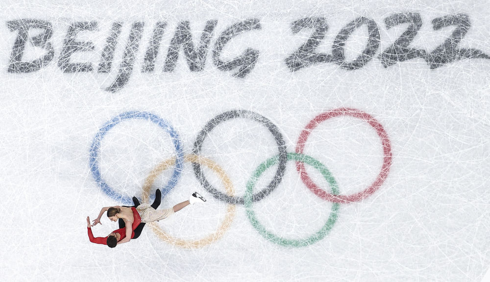 ↑2022年2月14日,法國選手加布麗埃拉·帕帕達(dá)基斯(上)和紀(jì)堯姆·西澤龍?jiān)诒本?022年冬奧會(huì)花樣滑冰冰上舞蹈比賽中,他們最終奪得該項(xiàng)目冠軍。