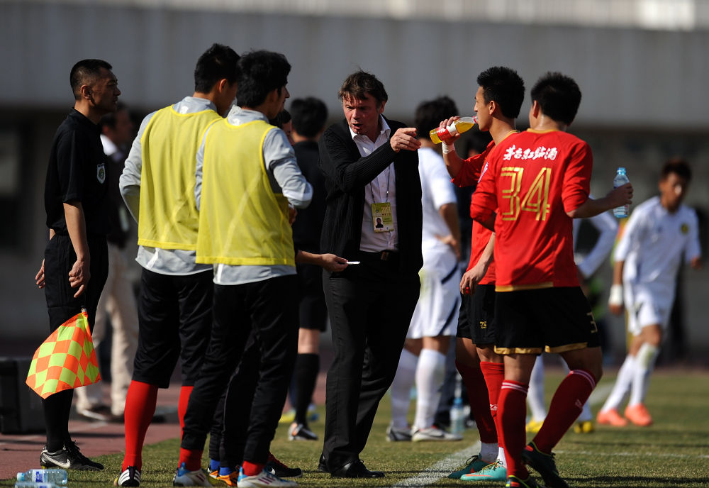 ↑2013年4月13日,時(shí)任深圳紅鉆隊(duì)法國主教練特魯西埃(中)在2013/2014賽季中國足球甲級(jí)聯(lián)賽第五輪中布置戰(zhàn)術(shù)。
