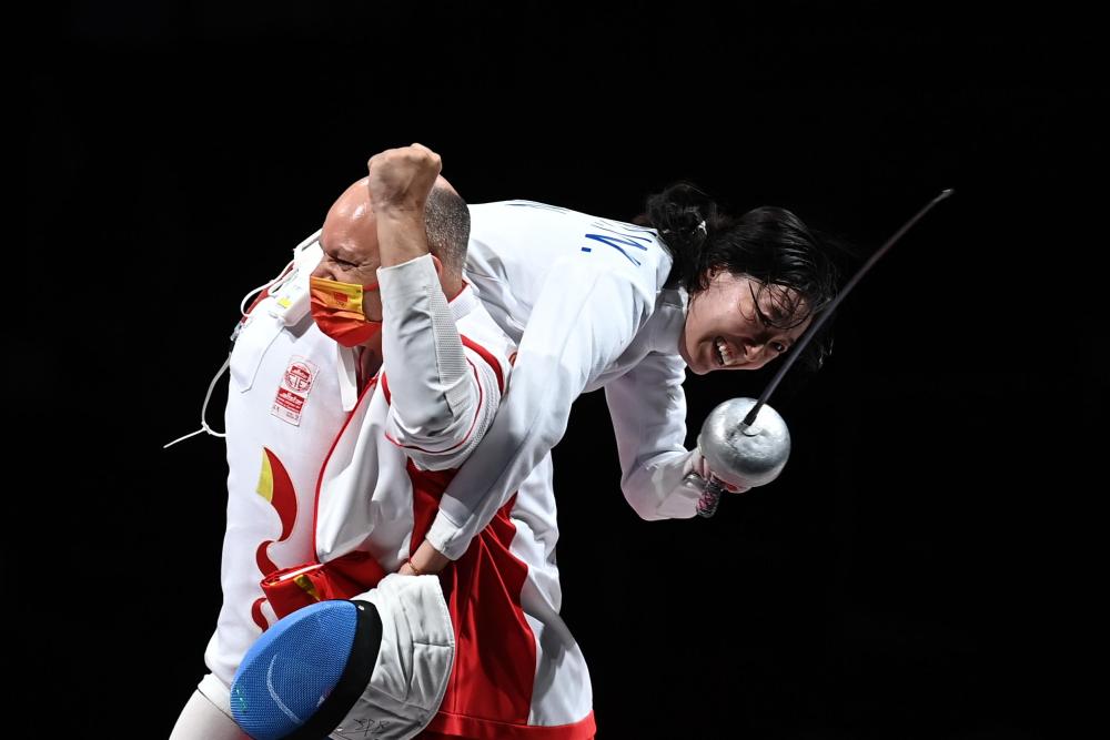 ↑2021年7月24日,孫一文(右)與法國籍主教練雨歌·歐伯利在東京奧運(yùn)會(huì)擊劍項(xiàng)目女子個(gè)人重劍決賽奪冠后慶祝。