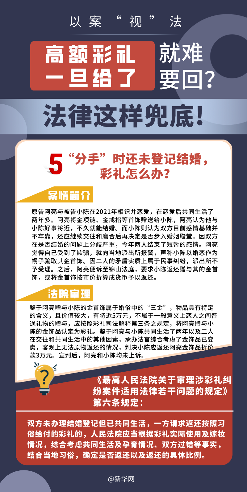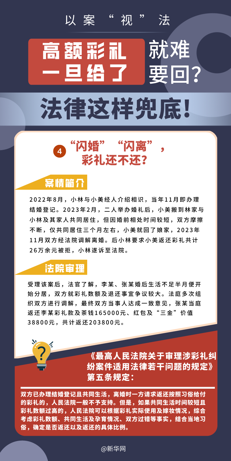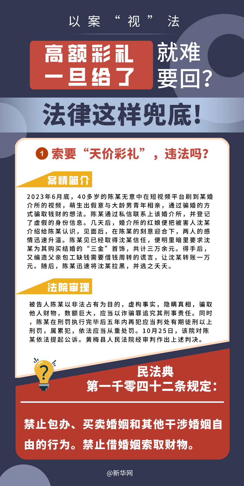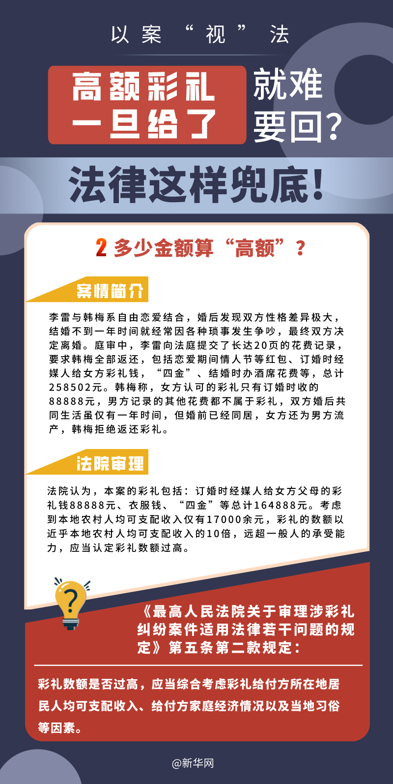 “五一”長假期間,各地迎來了婚禮高峰期,“彩禮”話題,尤其農(nóng)村高額彩禮現(xiàn)象備受關(guān)注。破解高價彩禮,在解決爭議的層面,司法盡了最大努力兜底。本期《以案“視”法》針對涉“高額彩禮”糾紛,帶大家學(xué)習(xí)相關(guān)法律知識。