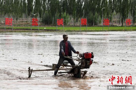 工作人員駕駛著插秧機,搶抓農時進行“海水稻”播種工作。中