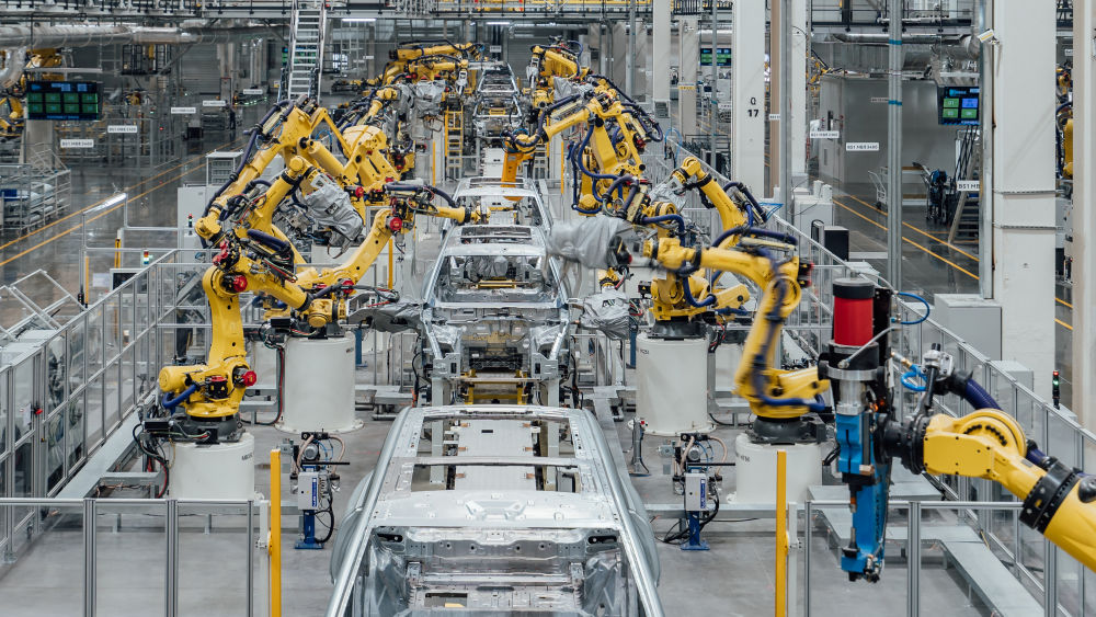 這是在重慶市兩江新區(qū)拍攝的賽力斯汽車超級(jí)工廠焊裝車間生產(chǎn)線(2024年2月26日攝,無(wú)人機(jī)照片)。新華社發(fā)(高彰 攝)