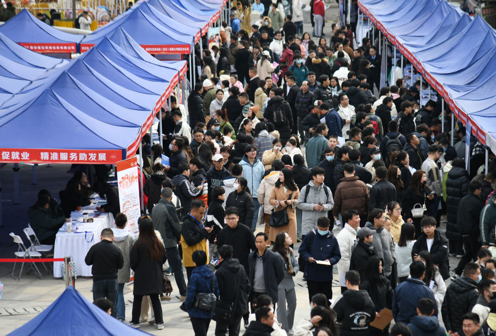 求職者在2024年陜西工會(huì)“春送崗位”就業(yè)服務(wù)月現(xiàn)場(chǎng)招聘會(huì)上了解招聘信息(2024年3月6日攝)。新華社記者 張博文 攝