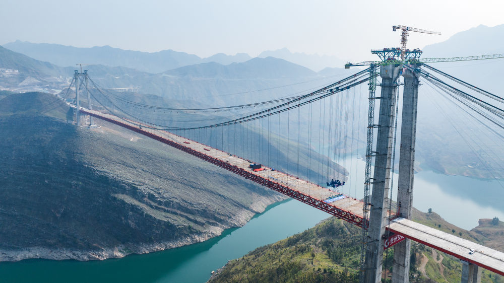 貴州交建集團(tuán)投資建設(shè)的納晴高速牂牁江大橋順利實(shí)現(xiàn)合龍,為納(雍)晴(?。└咚偃€建成通車打下堅(jiān)實(shí)基礎(chǔ)(4月28日攝,無(wú)人機(jī)照片)。新華社記者 陶亮 攝