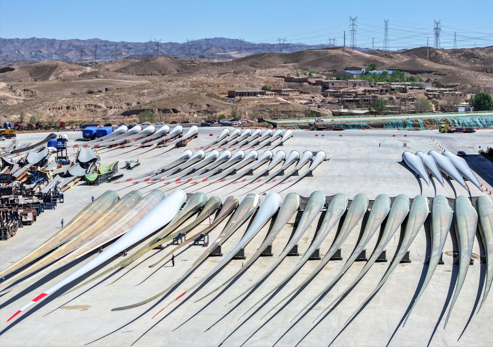 2024年5月11日拍攝的碼放在內蒙古包頭市石拐區(qū)一家風電設備制造企業(yè)廠區(qū)內的葉片(無人機照片)。