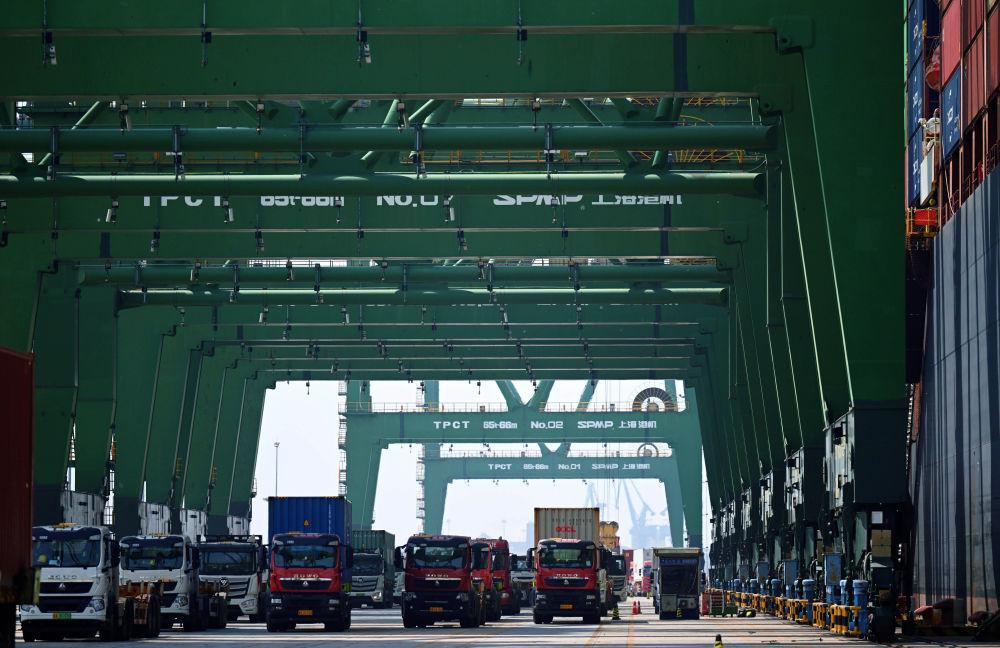 5月29日,卡車在天津港太平洋國(guó)際集裝箱碼頭運(yùn)輸集裝箱。新華社發(fā)