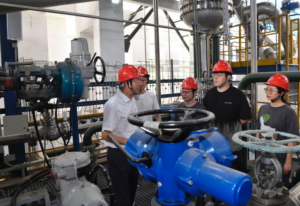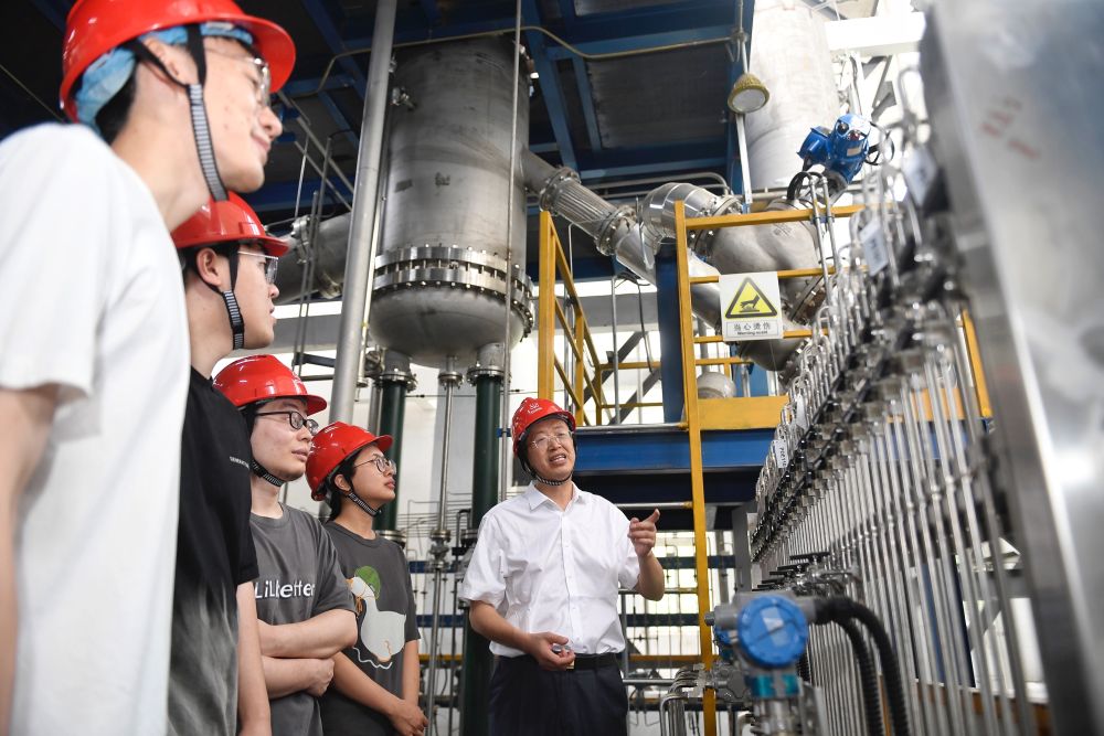 5月24日,在位于成都的中國核動力研究設(shè)計院內(nèi),鐘元章(右一)與團(tuán)隊年輕人在試驗(yàn)臺架上交流。