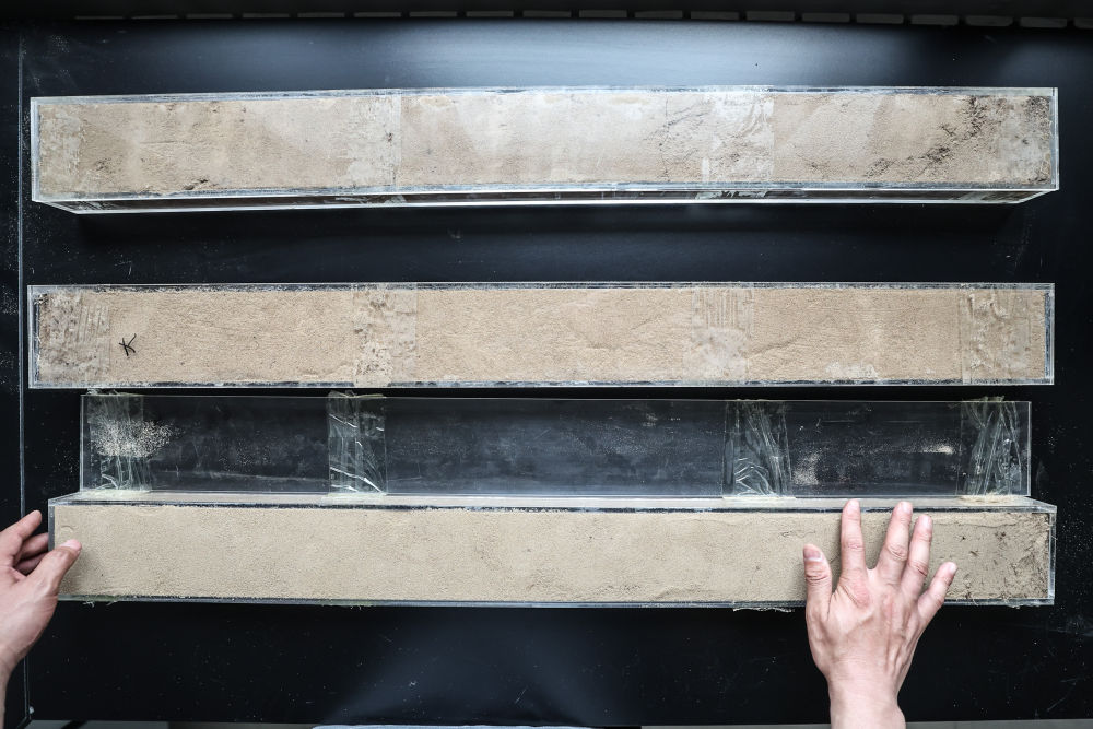 “草根博士”呂林有在遼寧省農(nóng)業(yè)科學院沙地治理與利用研究所章古臺基地實驗室整理提取的沙地土壤剖面樣本(2024年5月30日攝)。新華社記者 潘昱龍 攝
