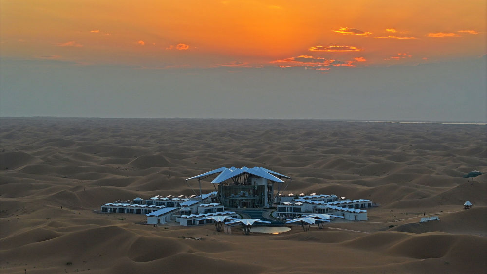 這是位于寧夏中衛(wèi)市沙坡頭景區(qū)的星星酒店(2023年9月6日攝,無人機照片)。新華社記者 王鵬 攝