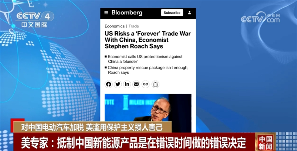 美國(guó)耶魯大學(xué)高級(jí)研究員斯蒂芬·羅奇稱:“我認(rèn)為這是美國(guó)選舉年由政治驅(qū)動(dòng)的巨大戰(zhàn)略錯(cuò)誤,對(duì)中國(guó)這樣一個(gè)在生產(chǎn)零碳新能源產(chǎn)品方面具有比較優(yōu)勢(shì)的國(guó)家,采取貿(mào)易保護(hù)主義立場(chǎng),在我看來,這可能是一個(gè)歷史性的錯(cuò)誤。零碳替代能源產(chǎn)品是受到氣候變化影響的世界所迫切需要的,這恰恰是在錯(cuò)誤的時(shí)間做了錯(cuò)誤的事。”