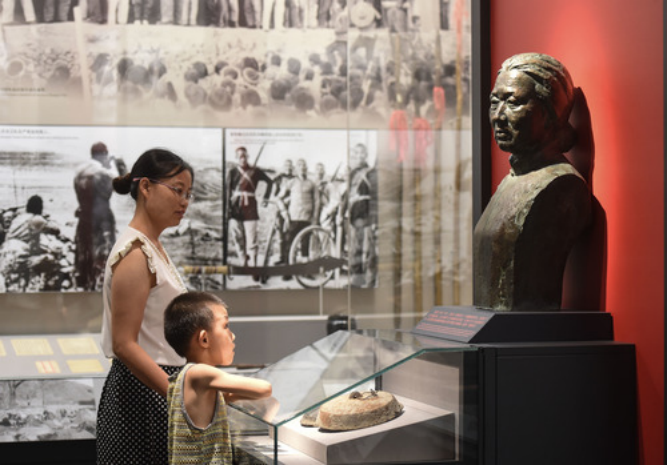 2015年7月12日,《偉大勝利 歷史貢獻(xiàn)》主題展覽上,觀眾在觀看“英雄母親”鄧玉芬的事跡。新華社記者 羅曉光 攝