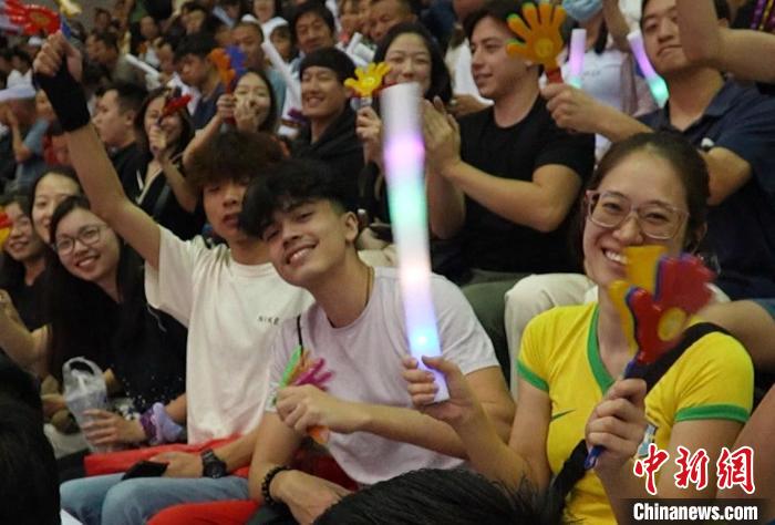 賽場上,球員們?nèi)Ρ寂?、激烈對抗,精彩的進(jìn)球引來觀眾陣陣歡呼。海外臺青也沉浸其中,目不轉(zhuǎn)睛地盯著賽場,和身邊的伙伴們討論著喜愛的球員?!拔覍侵夜懦擎?zhèn)隊印象最深刻,尤其是6號選手,他的投籃非常精準(zhǔn)?!笔状蝸淼酱箨懙暮M馀_青李文陽說。