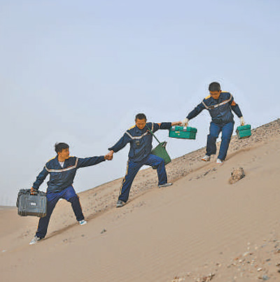 班組成員在翻越沙丘。 2014年,烏魯木齊西車輛段哈密動(dòng)態(tài)檢測(cè)車間哈羅班組正式成立,負(fù)責(zé)維護(hù)哈羅鐵路沿線設(shè)備。10年來,哈羅班組堅(jiān)守在環(huán)境惡劣、條件艱苦的羅布泊,克服重重困難,做好鐵路巡檢和故障維修,保障鉀肥運(yùn)輸。 羅布泊,位于新疆東南部塔克拉瑪干沙漠邊緣,天上無飛鳥,地上不長草,只有漫無邊際的沙漠、戈壁、鹽堿灘。 這里一年中有200多天風(fēng)沙肆虐,夏季氣溫超過50攝氏度,冬季氣溫低至零下30攝氏度。這里是中國鐵路烏魯木齊局集團(tuán)有限公司烏魯木齊西車輛段哈密動(dòng)態(tài)檢測(cè)車間哈羅班組工作的地方。 是什么讓他們選擇到羅布泊工作?又是什么工作值得他們?cè)谶@里堅(jiān)守10年? “鐵路修到哪兒,人員就要配到哪兒” 嗚—— “火車進(jìn)站了,快!” 哈羅班組工長臺(tái)欣龍和伙伴們沖向站臺(tái),幾個(gè)人一下子堵在了車門前。 “老吳,這回有啥?” “今兒有羊肉、雞蛋,還有一袋子番茄?!?/p> “嘿嘿嘿。” 車門旁,幾個(gè)大小伙兒咧著嘴憨笑。 臺(tái)欣龍工作的地方,叫羅中站,是哈羅鐵路的最后一站,地處羅布泊中心。這里雖通了電、通了水,但米、面、糧、油、飲用水等生活物資全靠火車從400公里外的哈密市送來。 “大小伙兒們,自己搬水?!绷熊囬L老吳一聲令下,臺(tái)欣龍和伙伴們麻利地爬上車,一人扛下一桶15升的礦泉水。 “這兒的水堿性大,一燒開,全是白粒粒,沒法喝?!迸_(tái)欣龍說,這15升礦泉水得撐一周。 在羅中站,差不多每隔5天會(huì)有通勤列車抵達(dá),送來各類物資。 列車停留5小時(shí),隨即返程。羅中站經(jīng)歷短暫的熱鬧后,再次回歸平靜。 除了人少、地荒、物資緊,寂寞、單調(diào)或許是在羅中站工作、生活面臨的最大困難。 這里沒有商店、沒有飯館、沒有影院。白天,手機(jī)還能有網(wǎng)絡(luò)信號(hào),晚上則幾乎沒有信號(hào)。乒乓球、象棋以及少量書籍,為臺(tái)欣龍和伙伴們提供了少有的娛樂方式。 2014年,中國鐵路烏魯木齊局集團(tuán)有限公司烏魯木齊西車輛段哈密動(dòng)態(tài)檢測(cè)車間哈羅班組正式成立,負(fù)責(zé)維護(hù)哈羅鐵路沿線設(shè)備。當(dāng)年,剛畢業(yè)的臺(tái)欣龍來到了這里。 當(dāng)時(shí)也沒想太多,覺得在哪里都是干活,就接受了單位安排?!拌F路修到哪兒,人員就要配到哪兒,這活總得有人干。”臺(tái)欣龍說。 如今,哈羅班組共有7人,大伙兒隔10天輪一次班。班組里年齡最大的丁鵬今年51歲了,最小的永志帥和杜權(quán)也已31歲。 “假如某個(gè)檢測(cè)站發(fā)出故障警報(bào),無論什么天氣,都必須立即響應(yīng)” 凌晨3時(shí)20分,顛簸了近5個(gè)小時(shí),臺(tái)欣龍和兩名隊(duì)員到達(dá)了黑龍峰動(dòng)態(tài)設(shè)備檢測(cè)站。這里,距離羅中站230公里。 夜間出行,沒有道路、沒有路燈、沒有導(dǎo)航,臺(tái)欣龍駕駛著皮卡車朝著鐵路延伸的方向在茫茫戈壁灘里蹚出路。這一路大坑套小坑,人的腦袋時(shí)不時(shí)頂?shù)杰図敚驳蒙邸?/p> 下了車,風(fēng)裹著沙子打在臉上、頭燈上,幾乎掩蓋了說話聲。時(shí)間長了,臺(tái)欣龍和隊(duì)友們便形成了默契,只需一個(gè)手勢(shì),便知道對(duì)方的意思。 4時(shí)10分,臺(tái)欣龍和隊(duì)友開始作業(yè)。 打開紅外線軸溫探測(cè)設(shè)備(THDS)的機(jī)蓋,映入眼簾的是一層厚厚的沙塵。臺(tái)欣龍熟練地拿出吹風(fēng)機(jī)、毛刷,仔細(xì)清理室外探頭箱里的沙塵,再把黑體(一種檢測(cè)設(shè)備)放置在探頭箱上,進(jìn)行溫度檢測(cè)校準(zhǔn)。 “我們這里夏季溫度高,若列車輪對(duì)軸溫超標(biāo),就有斷軸風(fēng)險(xiǎn),引發(fā)安全事故。檢測(cè)儀器必須保證準(zhǔn)確性?!迸_(tái)欣龍解釋,根據(jù)標(biāo)準(zhǔn),THDS低溫檢測(cè)誤差正負(fù)不得超過2攝氏度,高溫時(shí)段不得超過3攝氏度。“但我們自己的要求是將誤差控制在1攝氏度?!?/p> 早晨7時(shí),臺(tái)欣龍一行結(jié)束檢測(cè)任務(wù),踏上了回程路,直到中午12時(shí)才趕回駐地。 “今天這一路,算順利的。”臺(tái)欣龍說,“假如某個(gè)檢測(cè)站發(fā)出故障警報(bào),無論什么天氣,都必須立即響應(yīng)。”在羅布泊,沙塵暴說來就來,一刮就是三四個(gè)小時(shí)。有一回,他們遇上特大沙塵暴,風(fēng)暴像堵墻一樣迎面撲來。越野車迎風(fēng)的一側(cè),車漆幾乎全被風(fēng)沙打掉。“幸虧附近有座橋涵,大伙兒在里頭躲了3個(gè)多小時(shí)?!憋L(fēng)暴過后,衣服上、頭發(fā)上、耳朵里、鼻孔里全都是沙子。一抬腳,鐵道路基上的風(fēng)沙已沒過膝蓋。 還有一次,冬季雪夜,臺(tái)欣龍和隊(duì)友們?nèi)ヌ幚砭o急故障。大雪的掩蓋,讓茫茫戈壁更難辨認(rèn)方向。“我們一不小心走錯(cuò)了方向,跑了很多冤枉路,最終汽車油料不足,只能請(qǐng)求救援,天亮了才出來?!迸_(tái)欣龍說。 “檢修得跟上,為鉀肥運(yùn)輸做好保障” 無水、無人、無城,哈羅鐵路為何要修往羅布泊? 原來,羅布泊寸草不生的地表之下,藏著世界上最大的硫酸鹽型含鉀鹵水礦床,占全國鉀資源量的三成。 長期以來,我國耕地面積中一半以上缺鉀,偏偏鉀鹽在我國屬稀缺礦種,農(nóng)民此前用的鉀肥,85%以上依賴進(jìn)口。羅布泊的發(fā)現(xiàn),讓許多人興奮不已