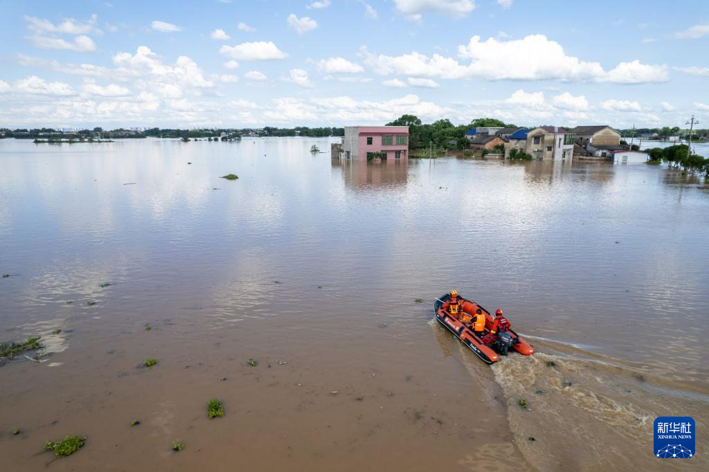 7月29日,在涓水湘潭縣河口鎮(zhèn)華中村堤段附近,搶險(xiǎn)人員搜尋被困群眾(無人機(jī)照片)。新華社記者 陳思汗 攝