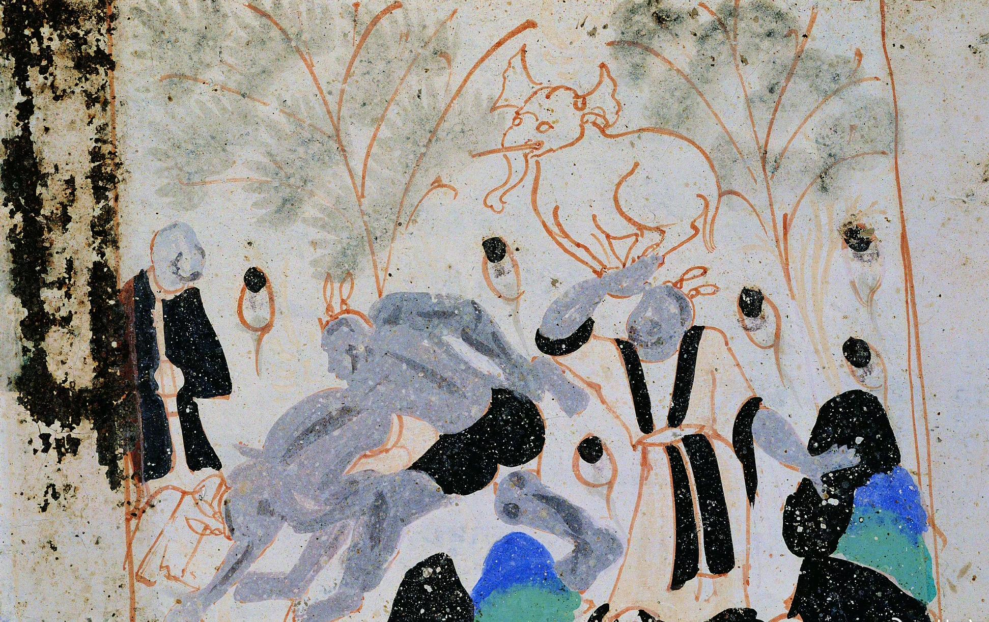 摔跤:古代運(yùn)動(dòng)中,摔跤就一直是主要的比賽項(xiàng)目之一。莫高窟第290窟中就描繪了一場(chǎng)緊張的摔跤比賽,畫面上,兩名頭扎丱角髻,下穿兜襠的對(duì)手正在一決勝負(fù),旁邊還繪有裁判。這幅千年前的畫面將摔跤、相撲比賽中講求技巧和戰(zhàn)術(shù)形象地表現(xiàn)了出來。莫高窟第290窟,北周。
