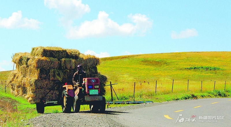 8月8日,位于裕民縣巴爾魯克山區(qū)的阿克喬克草原,牧民駕駛拖拉機(jī)拉運(yùn)草料。近年來,該縣通過對農(nóng)村公路升級改造,優(yōu)化了城鄉(xiāng)公路網(wǎng),為農(nóng)牧民出行、農(nóng)作物運(yùn)輸提供更多便利條件。 楊化光攝
