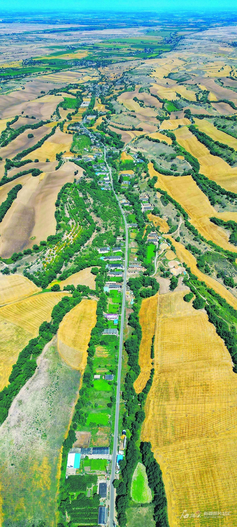 俯瞰木壘哈薩克自治縣英格堡鄉(xiāng)廟爾溝村(8月2日無人機(jī)攝)。通過廟爾溝村的鄉(xiāng)道串聯(lián)著戶戶農(nóng)家,也串聯(lián)出鄉(xiāng)村振興新圖景。 石榴云/新疆日報(bào)記者蔡增樂攝