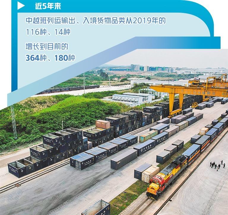 數(shù)據(jù)表明,高效、實(shí)惠、便捷的中越班列已得到市場(chǎng)認(rèn)可。近5年來(lái),中越班列運(yùn)輸出、入境貨物品類從2019年的116種、14種,增長(zhǎng)到目前的364種、180種。中越班列集貨地已覆蓋廣西及周邊省份20多個(gè)地市,跨境貨物運(yùn)輸覆蓋越南、老撾、泰國(guó)等多個(gè)東盟國(guó)家。