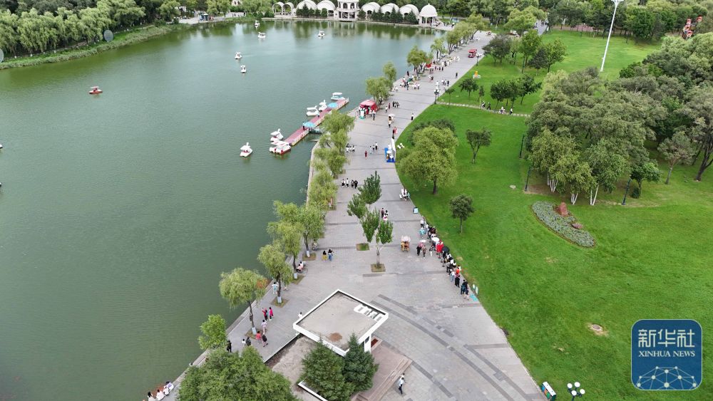 人們在龍江森工集團(tuán)綏棱林業(yè)局生態(tài)文化旅游景區(qū)一處公園游覽(7月25日攝,無人機(jī)照片)。