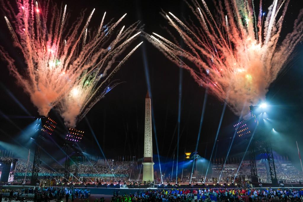8月28日,巴黎協(xié)和廣場(chǎng)開(kāi)幕式現(xiàn)場(chǎng)的焰火表演。新華社記者 張鋮 攝