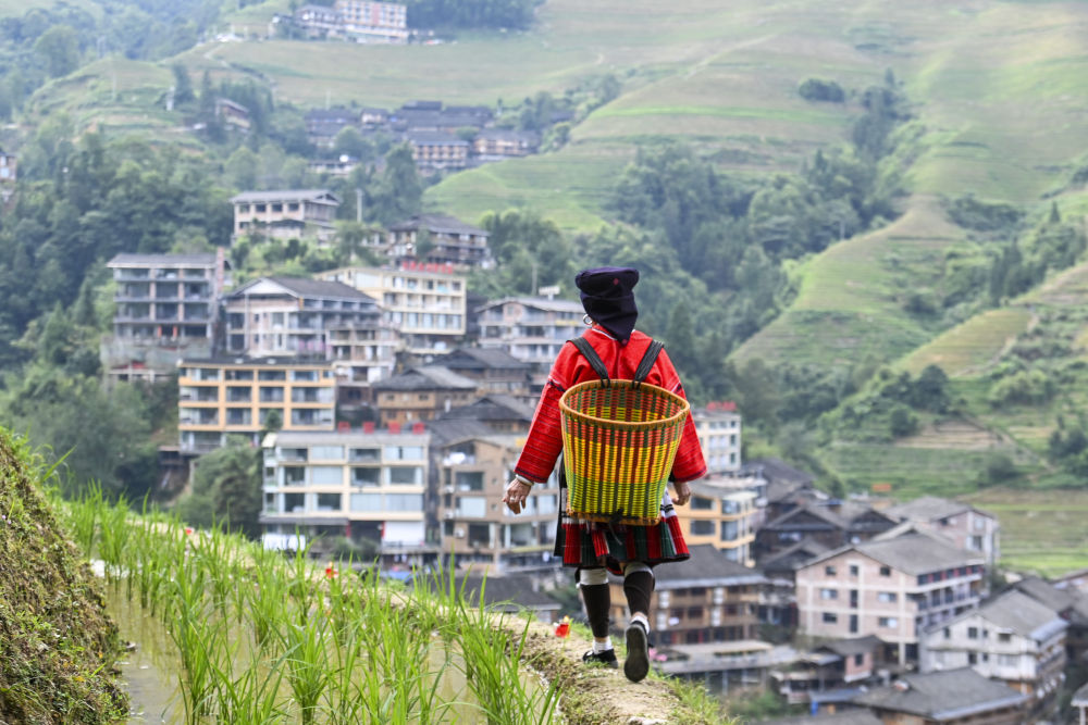 在龍勝各族自治縣龍脊鎮(zhèn)大寨村,身穿紅瑤服飾的村民行走在梯田間。新華社記者陸波岸 攝