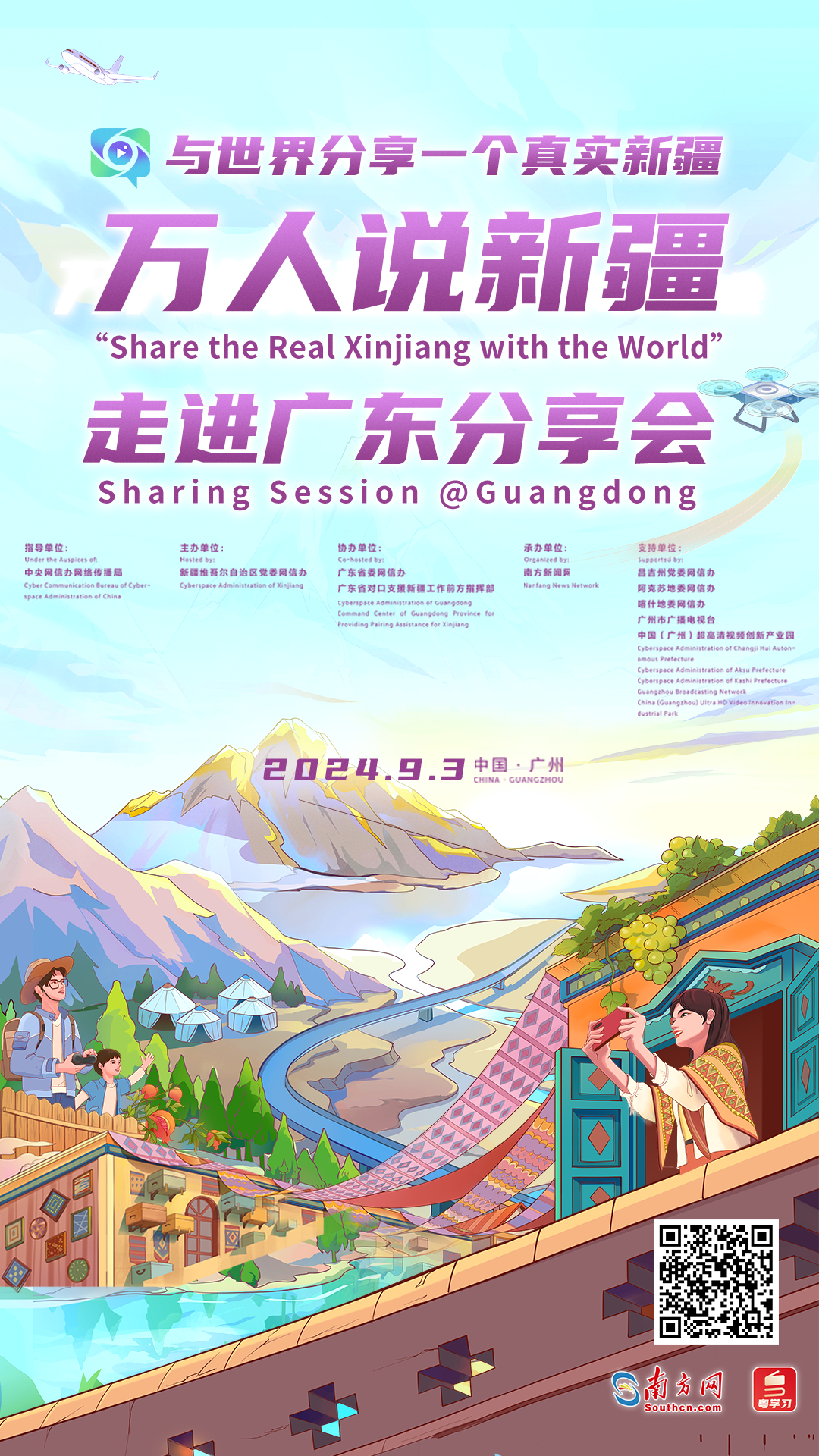 在交流互鑒中把新疆溫柔地說與全世界,在新粵兩地合作中感悟跨“粵”千里的援疆故事?!叭f人說新疆”走進廣東分享會將于9月2日至3日在廣州舉行。此次活動由新疆維吾爾自治區(qū)黨委網(wǎng)信辦主辦,廣東省委網(wǎng)信辦、廣東省對口支援新疆工作前方指揮部協(xié)辦,南方新聞網(wǎng)承辦。分享會從國內(nèi)知名學者、外籍專家、海內(nèi)外博主、援疆干部、港澳青年等不同視角,講述有溫度、有情懷、接地氣的美好新疆故事。