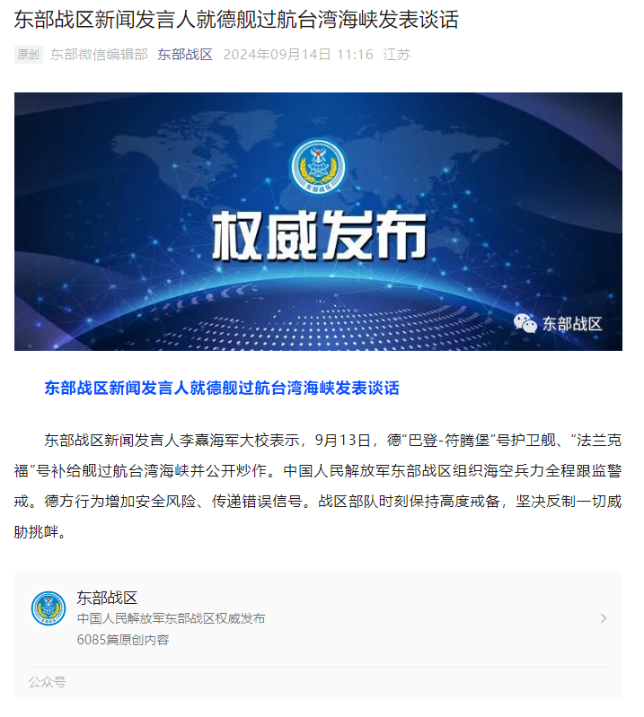 東部戰(zhàn)區(qū)新聞發(fā)言人李熹海軍大校表示,9月13日,德“巴登-符騰堡”號護(hù)衛(wèi)艦、“法蘭克?!碧栄a(bǔ)給艦過航臺灣海峽并公開炒作。中國人民解放軍東部戰(zhàn)區(qū)組織??毡θ谈O(jiān)警戒。德方行為增加安全風(fēng)險、傳遞錯誤信號。戰(zhàn)區(qū)部隊時刻保持高度戒備,堅決反制一切威脅挑釁。