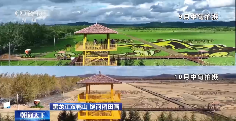 現(xiàn)在看到的綠色的稻田畫是9月中旬記者在黑龍江省雙鴨山市饒河縣拍攝的,黃色的稻田畫是10中旬同一地方拍攝。豐收前的稻田綠意盎然,稻葉挺拔、稻花清香、充滿生機;即將迎來豐收的稻田稻穗垂掛,陽光下金光閃閃,田野如金色海洋般燦爛,美不勝收。