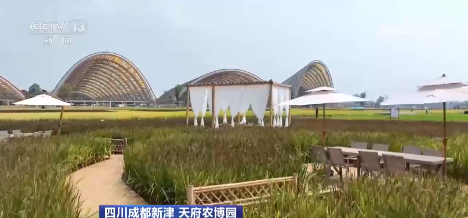 四川成都新津天府農(nóng)博園里,紫黑、紫紅、金黃三種特種稻種和大田水稻一起組成多彩圖案和造型,每畝預計產(chǎn)量躍上800斤的新高。稻田邊創(chuàng)意涌動,一杯杯稻田咖啡香醇四溢,一朵朵葵花正在向陽綻放,悠然演奏著喜悅豐收的“大地樂章”。