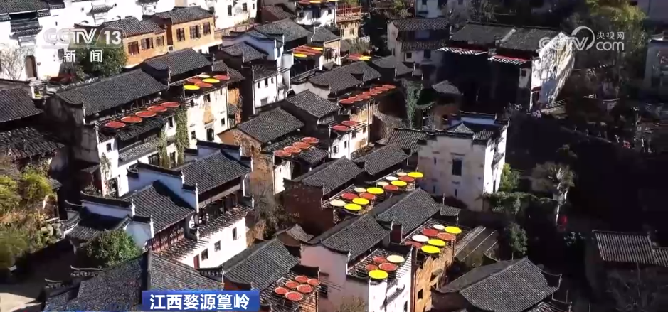 在江西婺源篁嶺,多種農(nóng)產(chǎn)品和徽派建筑對比鮮明,共同構成了婺源獨特的“曬秋”景觀。優(yōu)質(zhì)的生態(tài)環(huán)境孕育了“紅、綠、黑、白、黃”五大特色物產(chǎn),“曬秋”成為“中國最美鄉(xiāng)村”的特有名片。