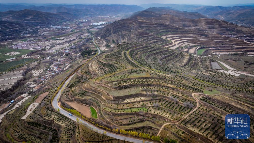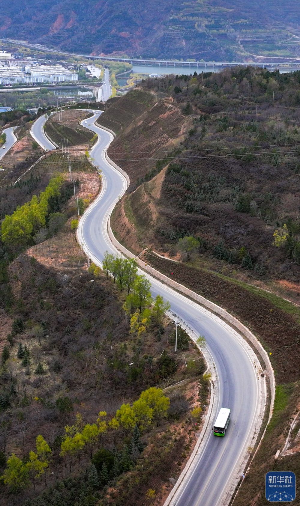 11月9日,一輛載有乘客和快遞物品的公交車從隆德縣城駛出(無人機(jī)照片)。