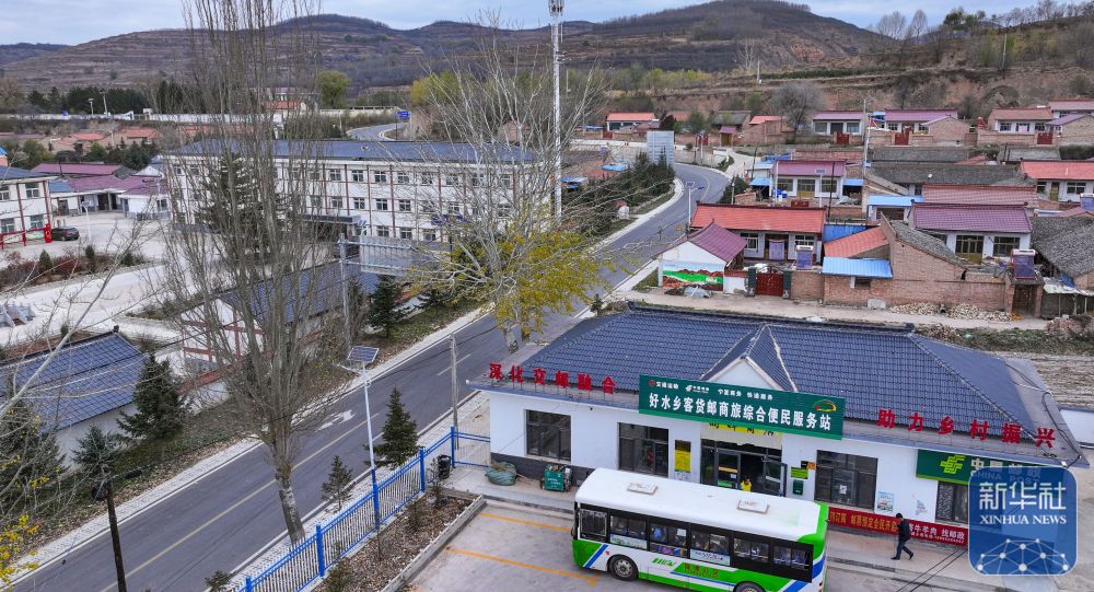 11月9日,一輛公交車停靠在隆德縣好水鄉(xiāng)客貨郵商旅綜合便民服務(wù)站,準(zhǔn)備卸下快遞(無人機(jī)照片)。
