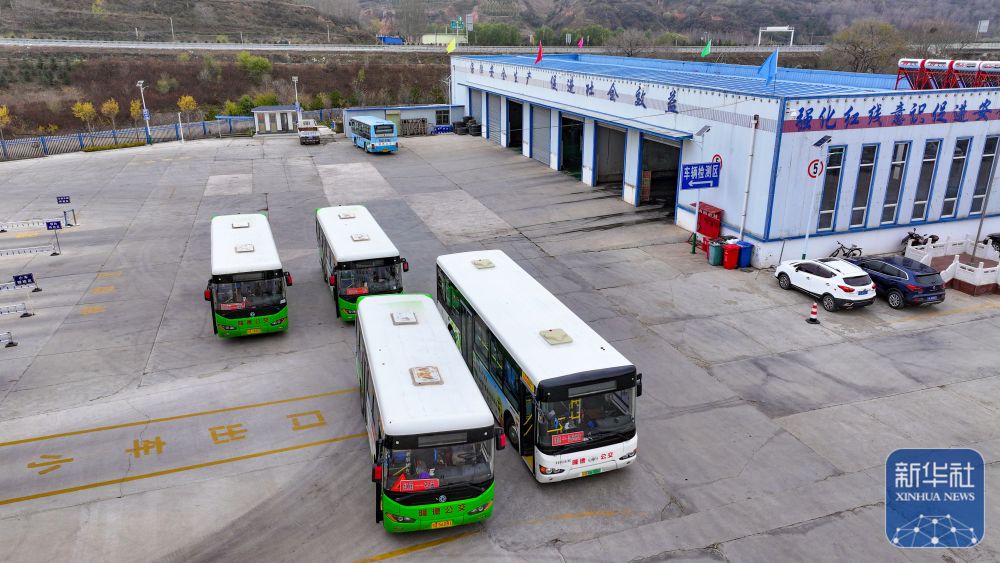 載有快遞物品的城鄉(xiāng)公交車即將從隆德縣公交公司駛出(11月9日攝,無人機(jī)照片)。