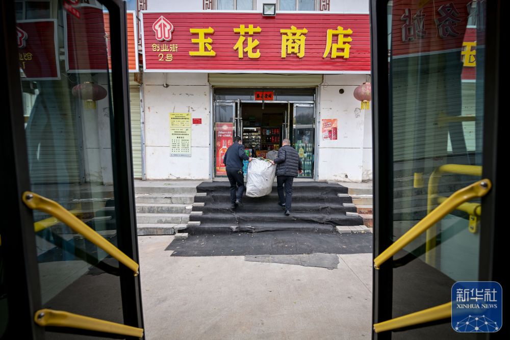 11月10日,隆德縣公交車司機(jī)(右)和聯(lián)財(cái)鎮(zhèn)聯(lián)合村快遞點(diǎn)經(jīng)營者將快遞卸下公交車。