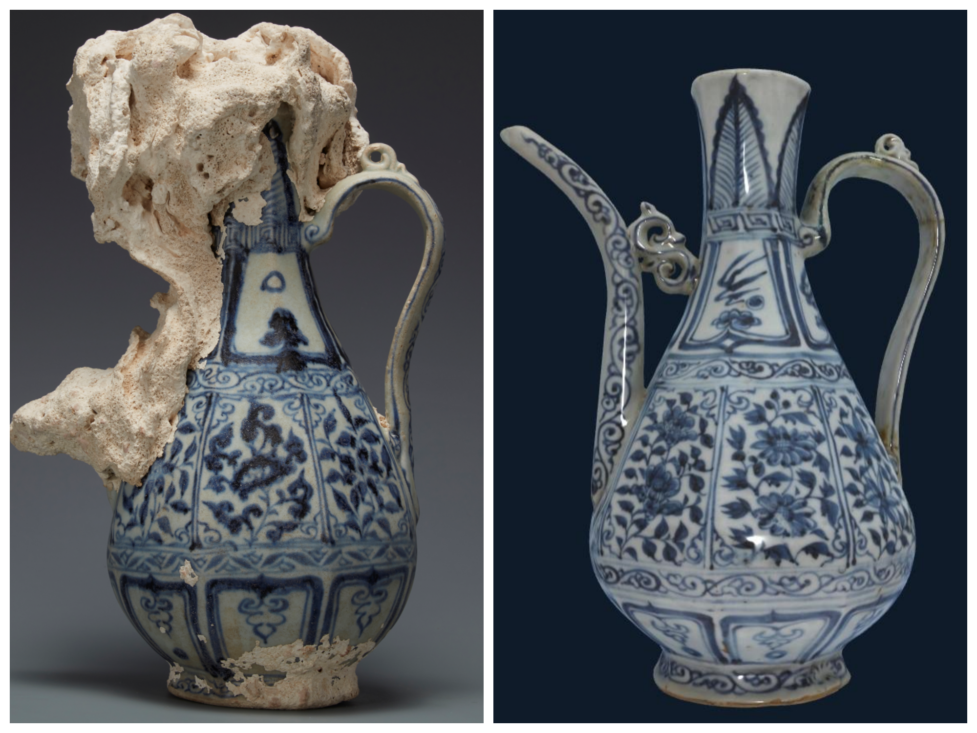△中國(guó)(海南)南海博物館藏元青花花卉紋八棱執(zhí)壺(左)與河北博物院藏青花八棱執(zhí)壺對(duì)比。