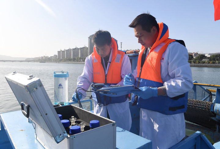 在丹江口庫(kù)區(qū)河南淅川縣鸛河流域城區(qū)段,南陽(yáng)市生態(tài)環(huán)境局淅川分局工作人員記錄采樣水質(zhì)情況(2024年11月28日攝)。新華社記者 郝源 攝