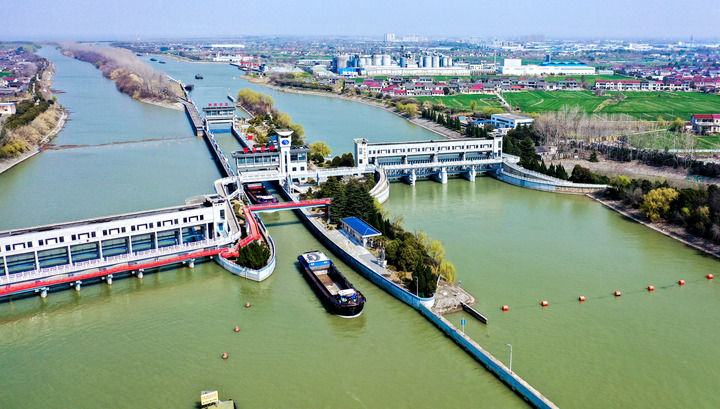 位于江蘇省揚(yáng)州市江都區(qū)的南水北調(diào)東線一期工程運(yùn)鹽閘、邵仙套閘、邵仙閘洞(2024年3月19日攝,無(wú)人機(jī)照片)。新華社發(fā)(任飛攝)