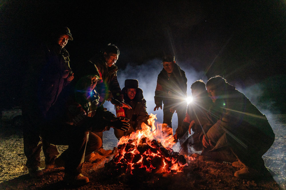 2024年5月10日,在羌塘國家級自然保護(hù)區(qū)核心區(qū)域,野生動物專業(yè)管護(hù)隊員在宿營地里烤火,燃料是野牦牛的糞便。羌塘國家級自然保護(hù)區(qū)位于西藏自治區(qū)北部,這里的管護(hù)隊員常年頂風(fēng)冒雪,穿越無人區(qū)進(jìn)行巡護(hù)。