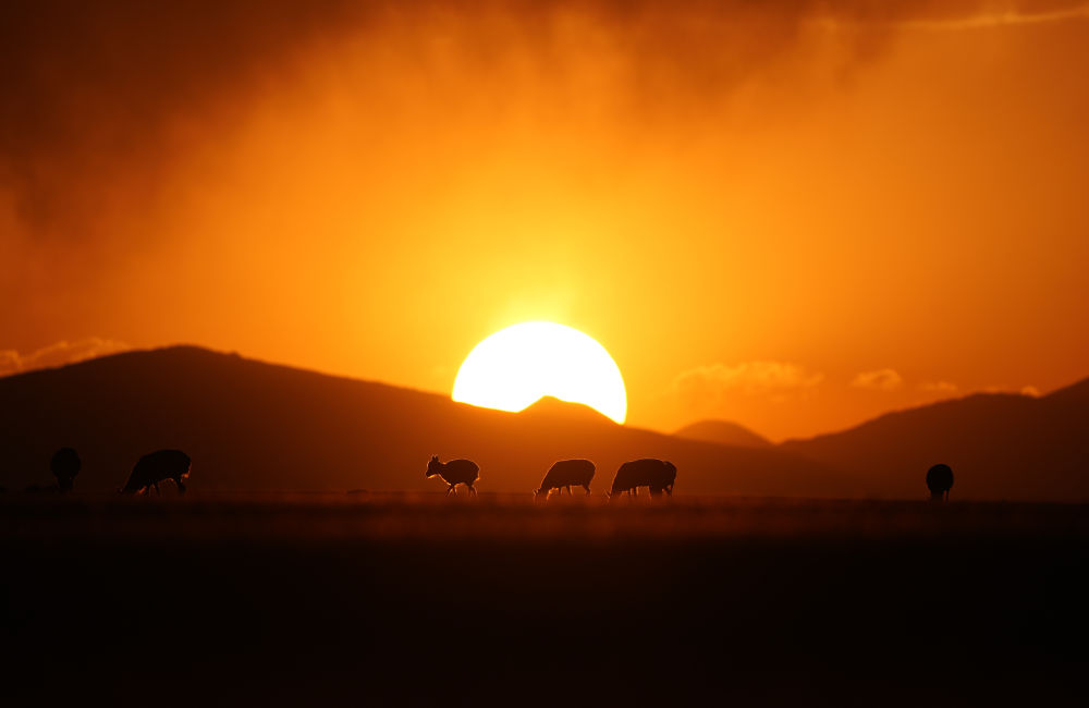 這是2024年6月16日拍攝的晚霞中魯確塘草原上待產(chǎn)的國家一級保護(hù)動物藏羚羊。