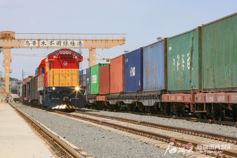 7月9日,一列新疆“天山號(hào)”多式聯(lián)運(yùn)品牌班列駛出烏魯木齊國際陸港區(qū)。石榴云/新疆日?qǐng)?bào)記者蔡增樂 攝