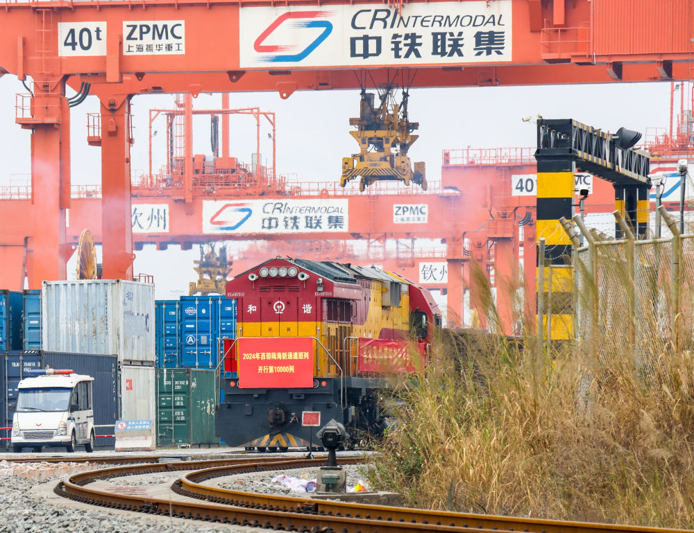 12月30日上午,一列滿載印尼起酥油、海南椰子汁等90個集裝箱的海鐵聯(lián)運班列,從欽州鐵路集裝箱中心站發(fā)出,駛向重慶團(tuán)結(jié)村站。這是2024年西部陸海新通道班列開行的第10000列,班列年度開行量首次突破萬列,同比增長5.1%。