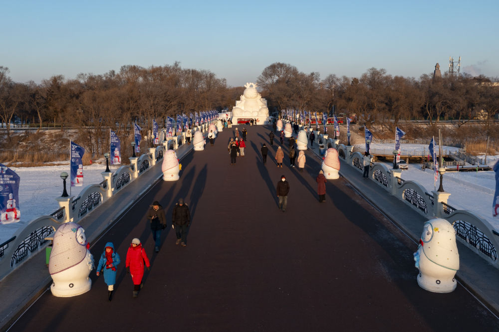 1月3日,在哈爾濱太陽島雪博會園區(qū)入口,游客經(jīng)過“雪人儀仗隊”(無人機照片)。