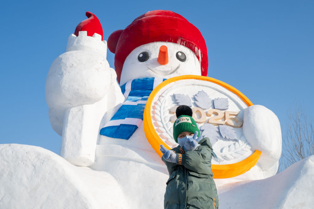 1月3日,在哈爾濱冰雪大世界園區(qū),游客與亞冬會吉祥物雪雕“濱濱”合影。
