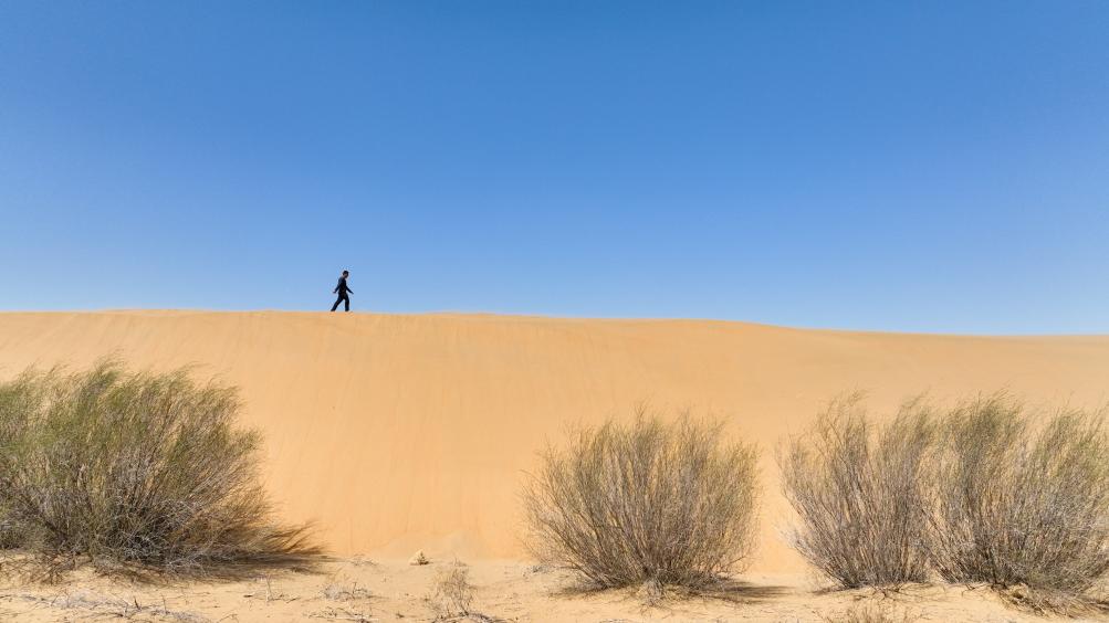 2024年4月11日,一名治沙人行走在達(dá)拉特旗境內(nèi)的庫布其沙漠里(無人機照片)。新華社記者 貝赫 攝