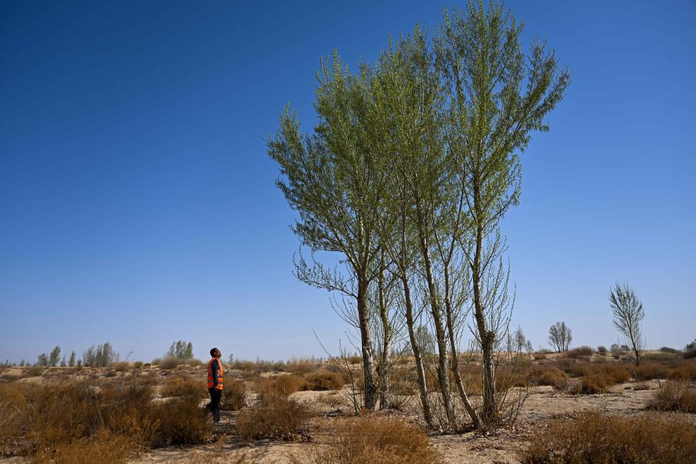 2024年4月11日,一名治沙人在達(dá)拉特旗境內(nèi)的庫布其沙漠里巡護樹木。新華社記者 李志鵬 攝