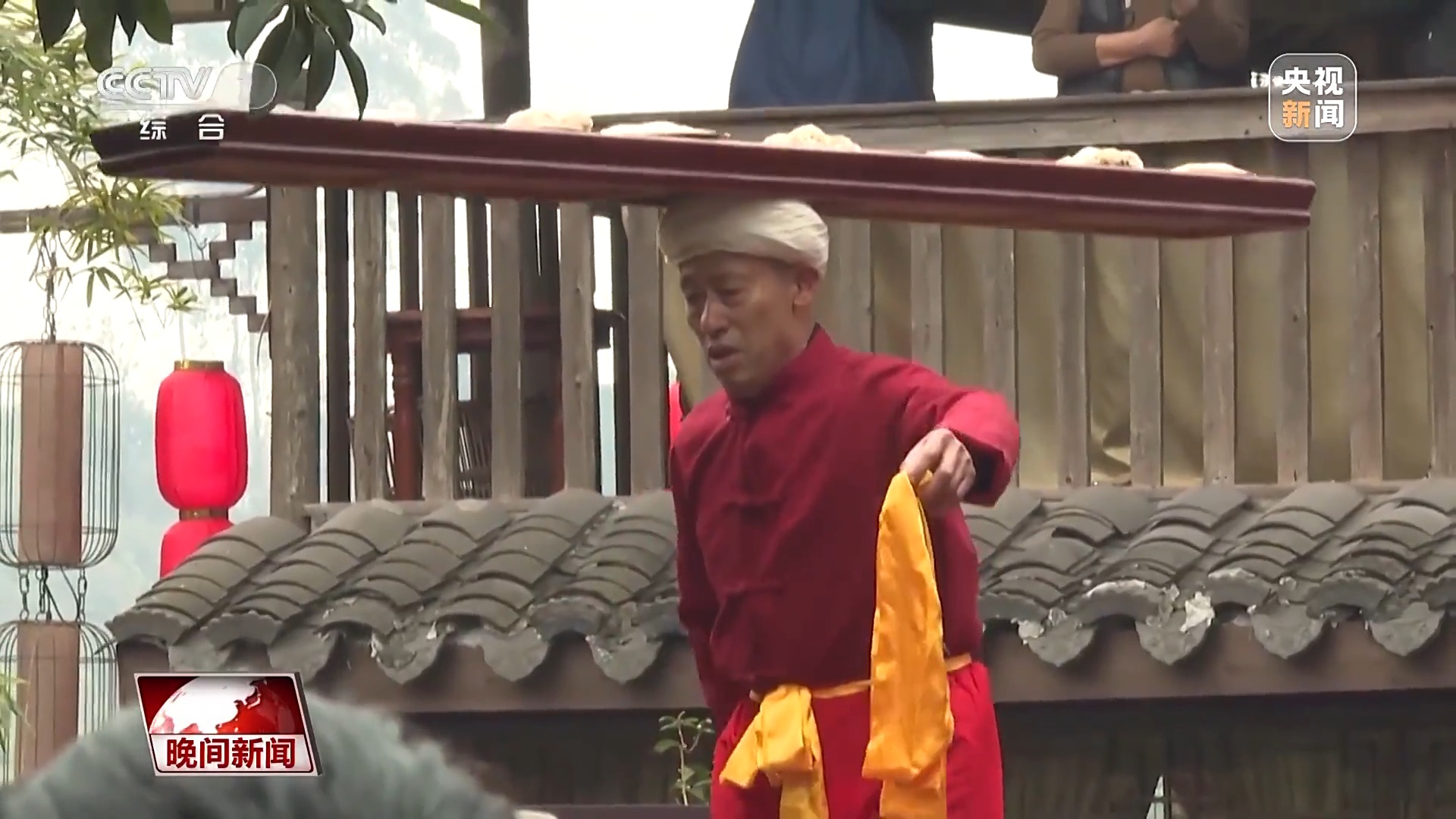 總臺(tái)記者 伍黎明:這會(huì)兒廚師們已經(jīng)做好了美味佳肴,正一道道上菜。這里邊包含了古鎮(zhèn)的特色美食石板糍粑、煙熏豆腐等。